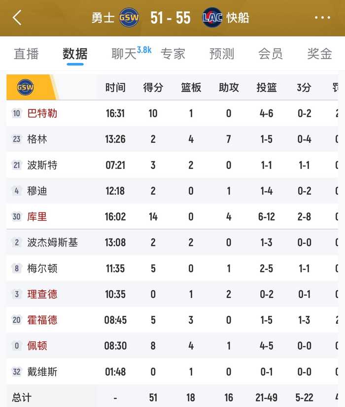 半场落后4分,最后三分钟打了一波9比2,防得也不错,不知道格林下半场能不能回来。