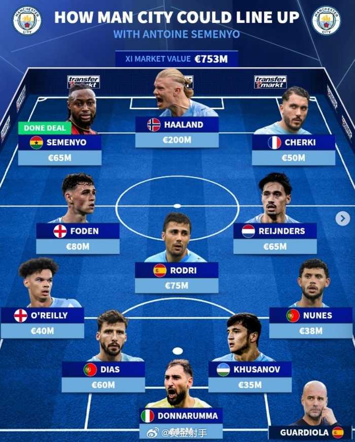 #曼城[超话]# 曼城签下伯恩茅斯边锋塞梅尼奥,《转会市场》也预测了曼城最新主力阵容情况。